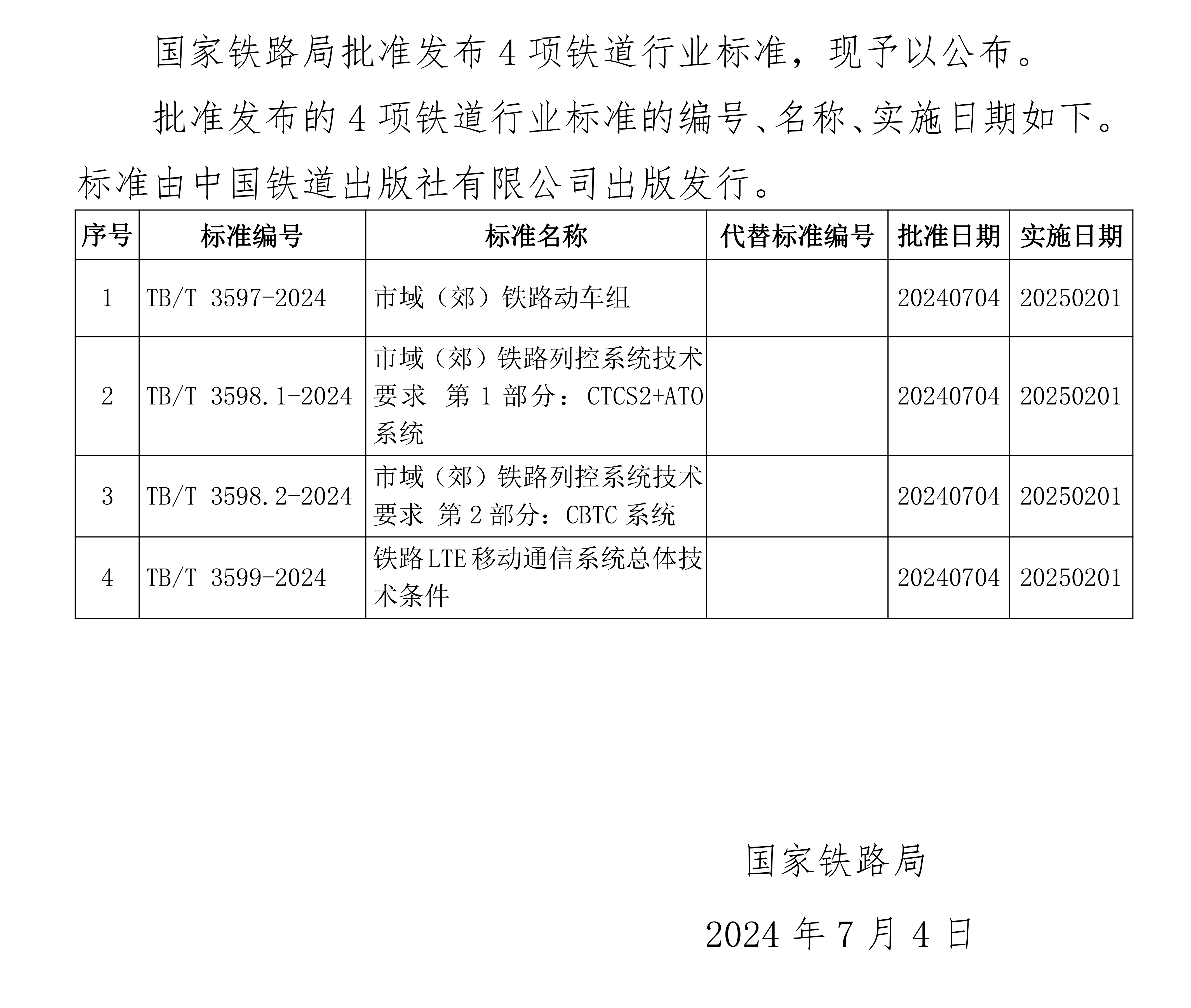 国家铁路局关于发布铁道行业标准的公告(技术标准2024年第6批)