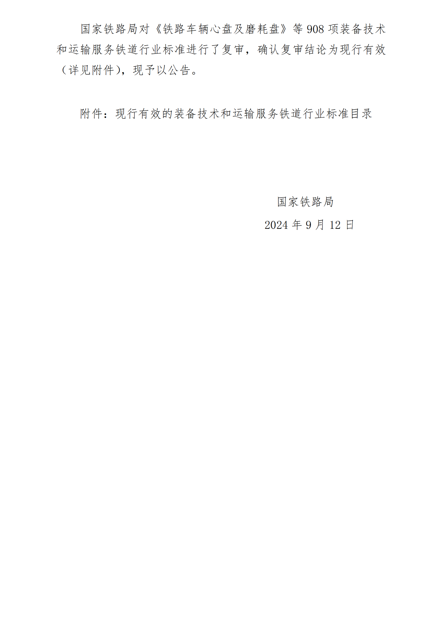 国家铁路局关于《铁路车辆心盘及磨耗盘》等908项铁道行业标准复审为现行有效的公告