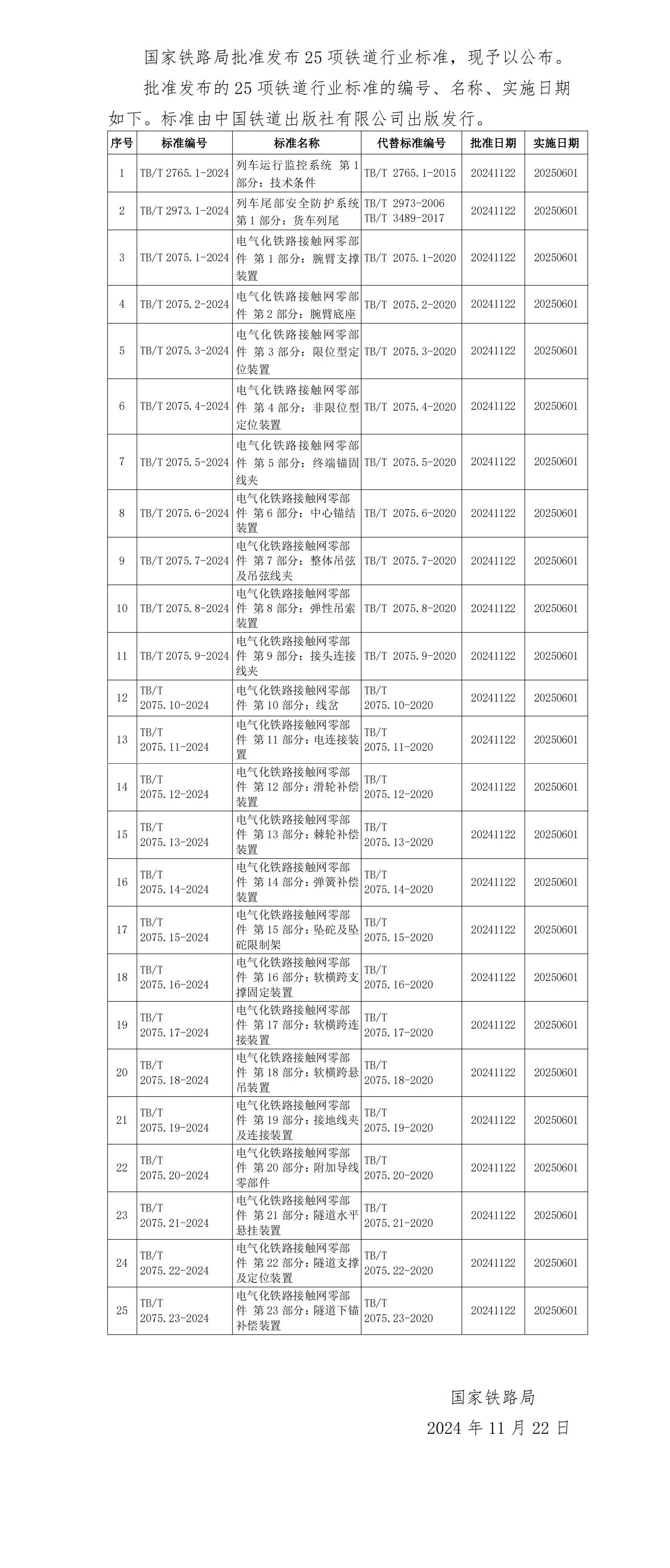 国家铁路局批准发布《列车运行监控系统 第1部分:技术条件》等25项铁道行业标准。