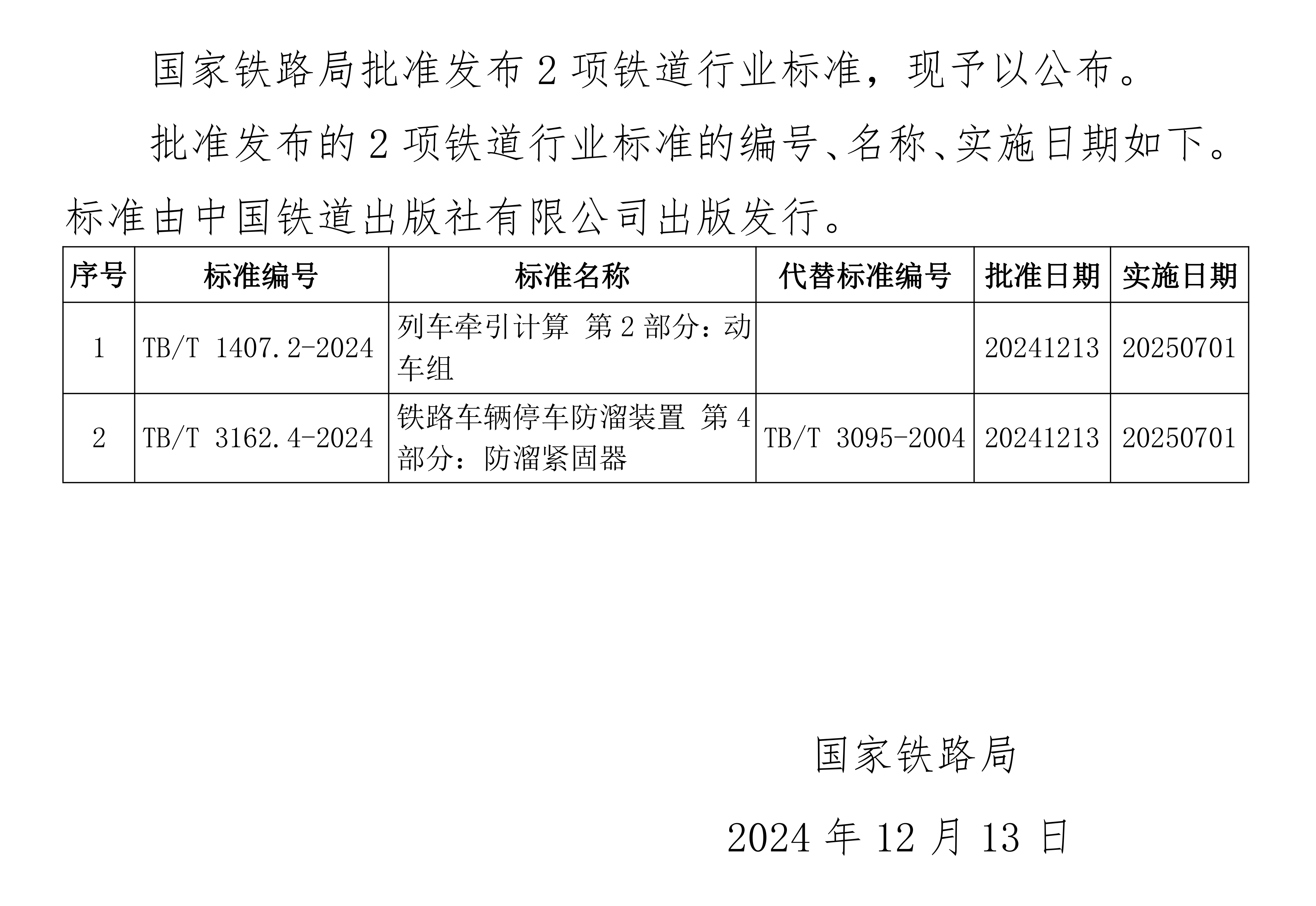 国家铁路局关于发布铁道行业标准的公告(技术标准2024年第12批)