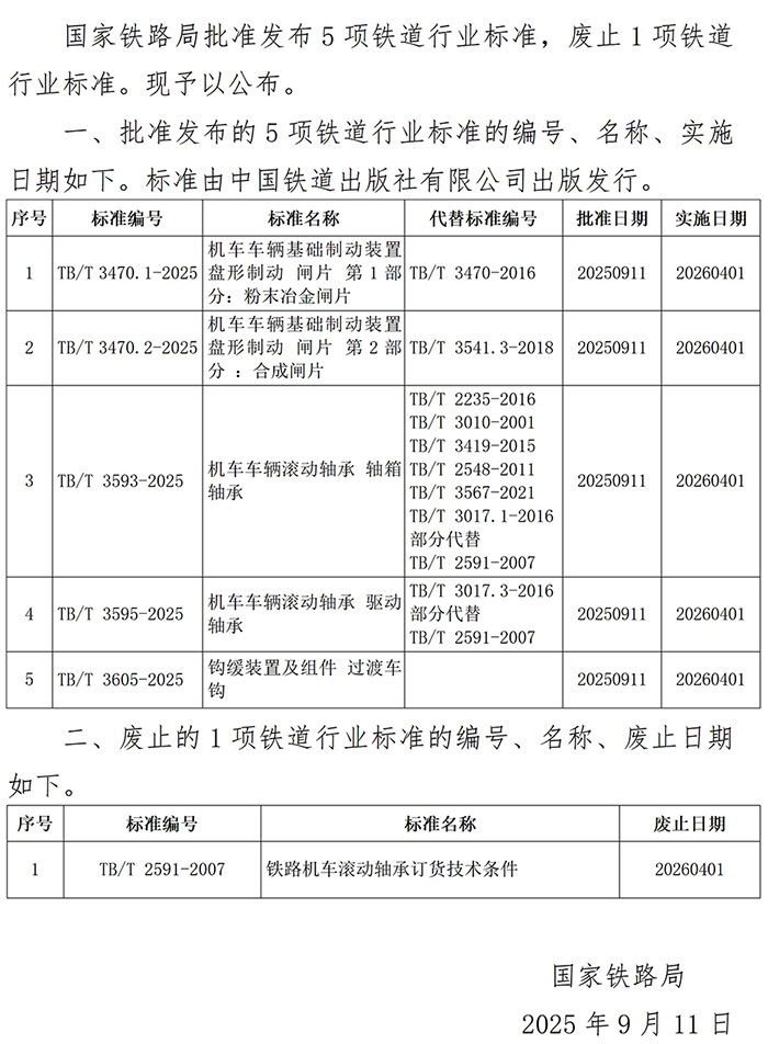 国家铁路局关于发布铁道行业标准的公告(技术标准2025年第5批)