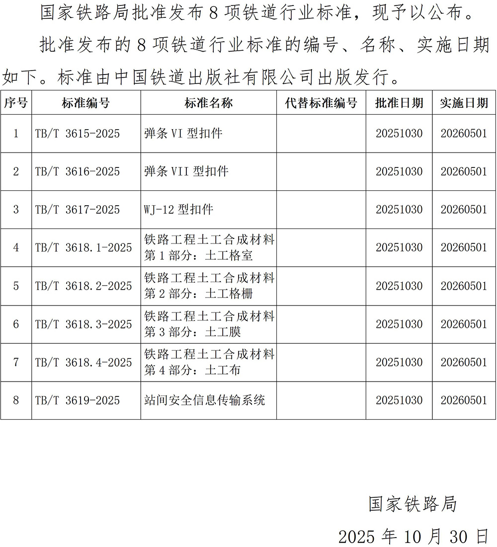 国家铁路局批准发布《弹条VI型扣件》等8项铁道行业标准。