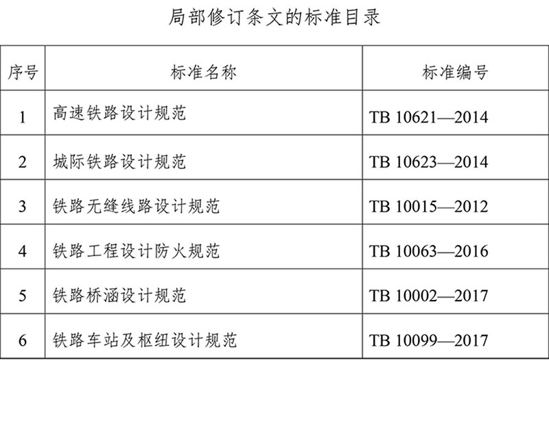 现公布《高速铁路设计规范》(TB 10621-2014)等6项标准的局部修订条文,同时废止《新建时速200~250公里客运专线铁路设计暂行规定》(铁建设〔2005〕140号)等5项标准,自2019年7月31日起施行。上述局部修订原标准的相应条文及相关内容同时废止。本局部修订条文由国家铁路局科技与法制司负责解释。