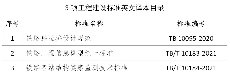 现发布《铁路斜拉桥设计规范》等3项工程建设标准英文译本。译本与中文版标准在技术上出现异议时,以中文版为准。以上译本由中国铁道出版社有限公司组织出版发行。