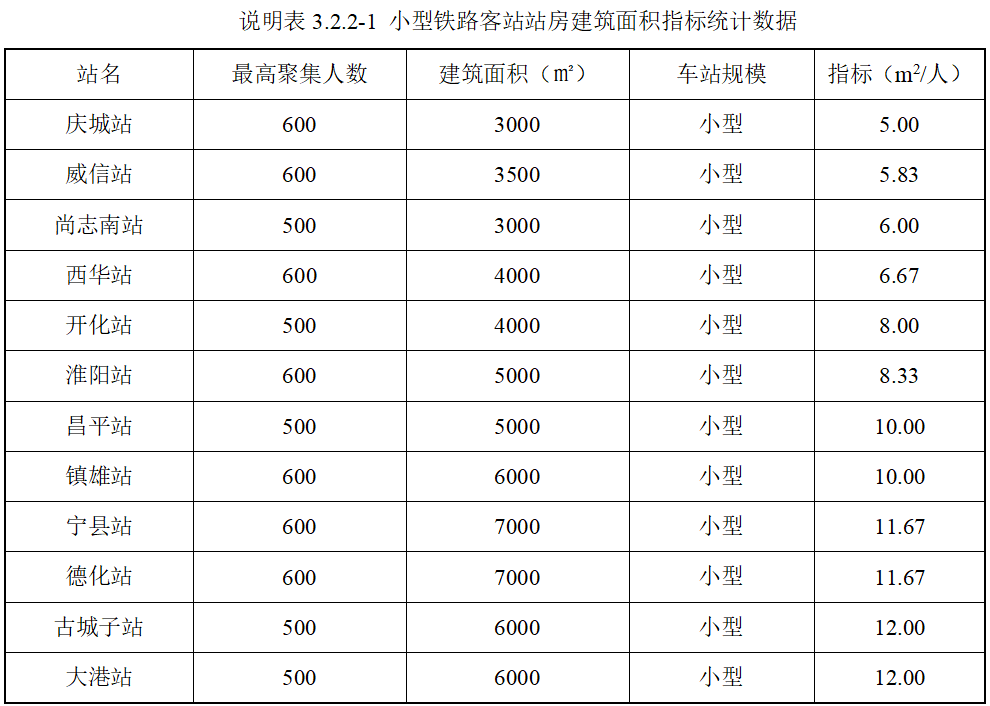 说明表3.2.2-1、3.2.2-2、3.2.2-3是近年运营效果较好的铁路客站站房的建筑面积指标统计数据。