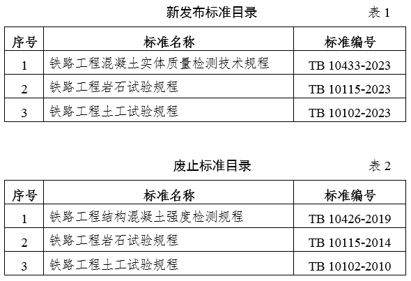 现公布《铁路工程混凝土实体质量检测技术规程》(TB 10433-2023)等3项铁路工程建设标准(见表1),自2023年8月1日起实施。以上标准由中国铁道出版社有限公司出版发行。《铁路工程结构混凝土强度检测规程》(TB 10426-2019)等3项铁路工程建设标准(见表2)同时废止。