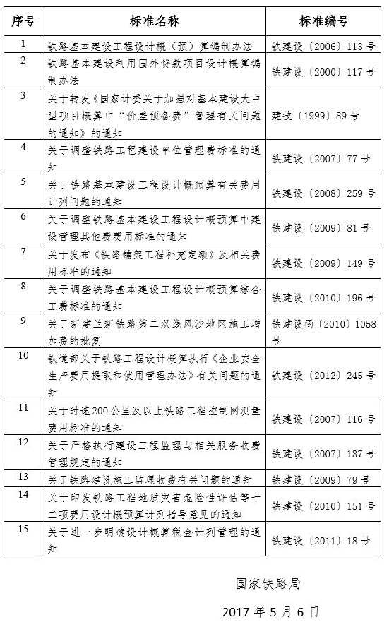 现公布《铁路基本建设工程设计概(预)算编制办法》(TZJ 1001-2017),自2017年7月1日起实施。《铁路基本建设工程设计概(预)算编制办法》(铁建设〔2006〕113号)等15项标准(详见附件)同时废止。