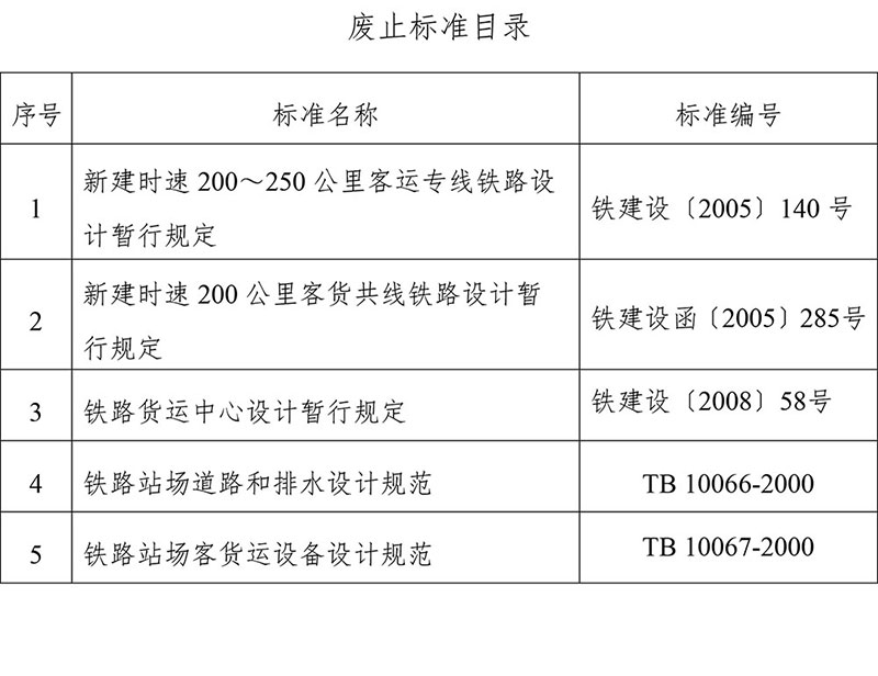 现公布《高速铁路设计规范》(TB 10621-2014)等6项标准的局部修订条文,同时废止《新建时速200~250公里客运专线铁路设计暂行规定》(铁建设〔2005〕140号)等5项标准,自2019年7月31日起施行。上述局部修订原标准的相应条文及相关内容同时废止。本局部修订条文由国家铁路局科技与法制司负责解释。