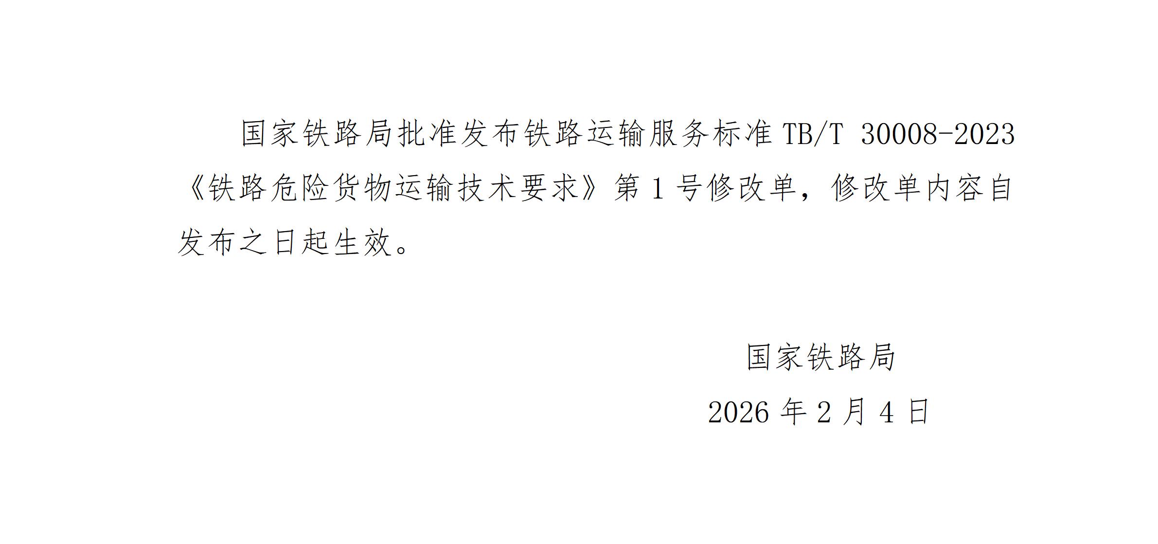 国家铁路局批准发布铁路运输服务标准TB/T 30008-2023《铁路危险货物运输技术要求》第1号修改单。