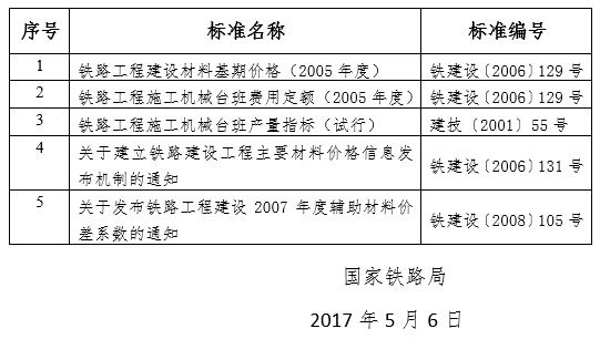现公布《铁路工程材料基期价格》(TZJ 3003-2017)和《铁路工程施工机具台班费用定额》(TZJ 3004-2017)铁路工程造价标准,自2017年7月1日起实施。《铁路工程建设材料基期价格(2005年度)》(铁建设〔2006〕129号)等5项铁路工程造价标准(详见附件)同时废止。