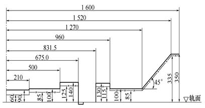 货物高站台边缘(只适用于线路的一侧)在高出轨面距离1 100 mm~4 800 mm间,距线路中心线距离可按1 850 mm设计。