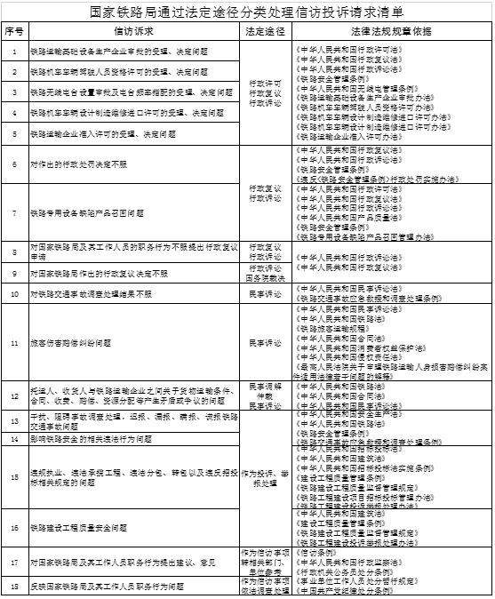 国家铁路局通过法定途径分类处理信访投诉请求清单