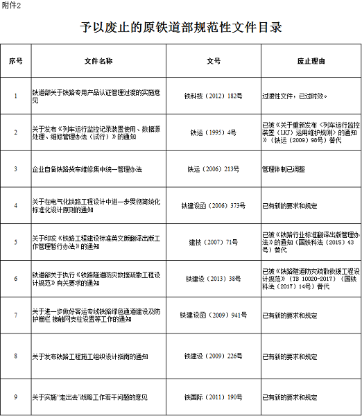 2.根据铁路改革发展实际,将《铁道部关于铁路专用产品认证管理过渡的实施意见》等适用期已过、管理体制已调整、已有新规定替代等9件文件(附件2)予以废止。