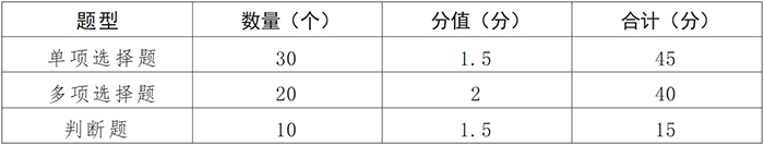 1.试题类型包括:单项选择题、多项选择题、判断题,全部为客观题。多项选择题中,全部选对得2分;少选,所选的每个选项得0.5分,多选、错选不得分。题型数量及分值见下表。