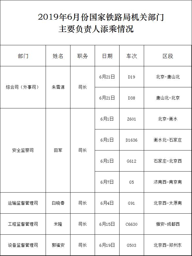 2019年6月份国家铁路局机关部门主要负责人添乘情况