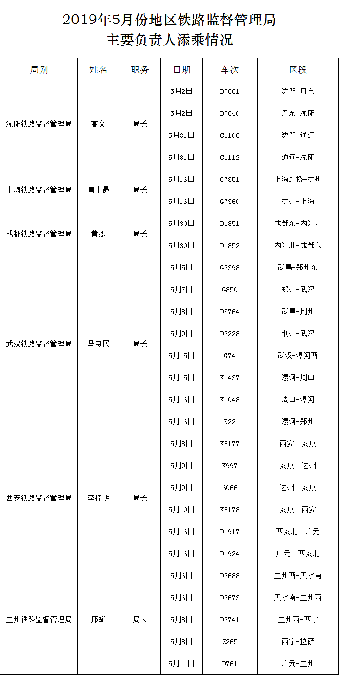 2019年5月份地区铁路监督管理局主要负责人添乘情况