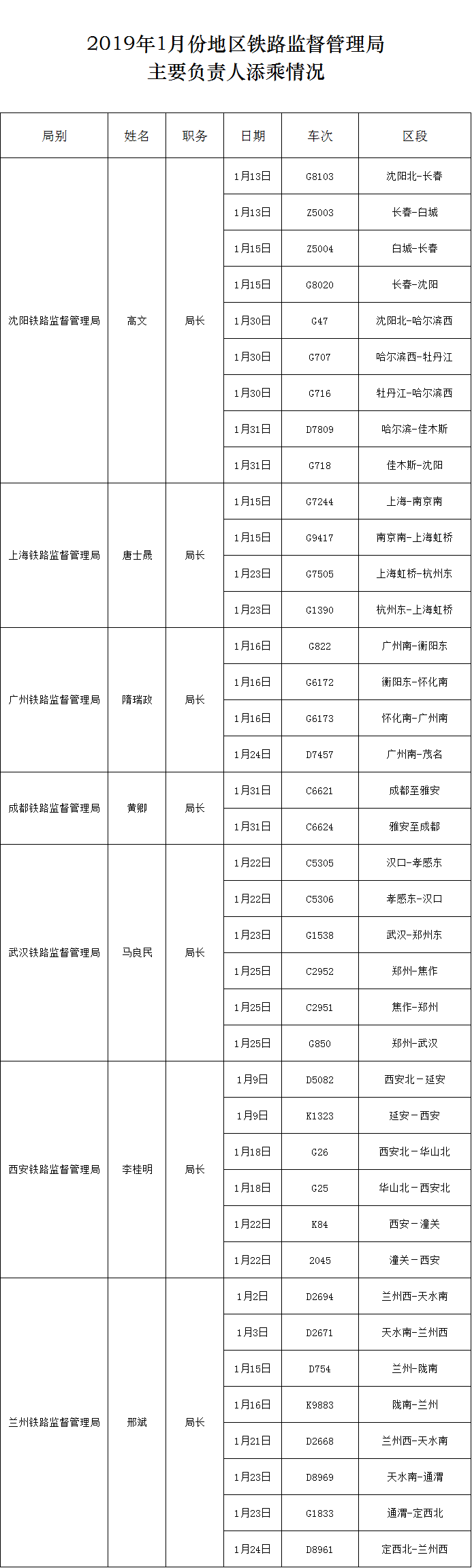 2019年1月份地区铁路监督管理局主要负责人添乘情况