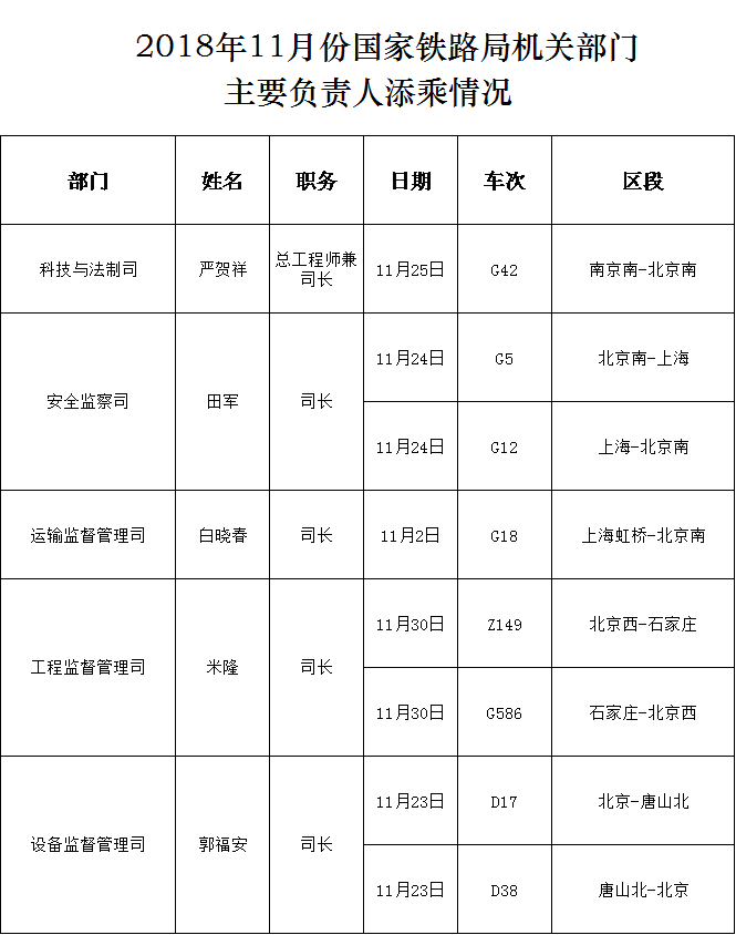 2018年11月份国家铁路局机关部门主要负责人添乘情况