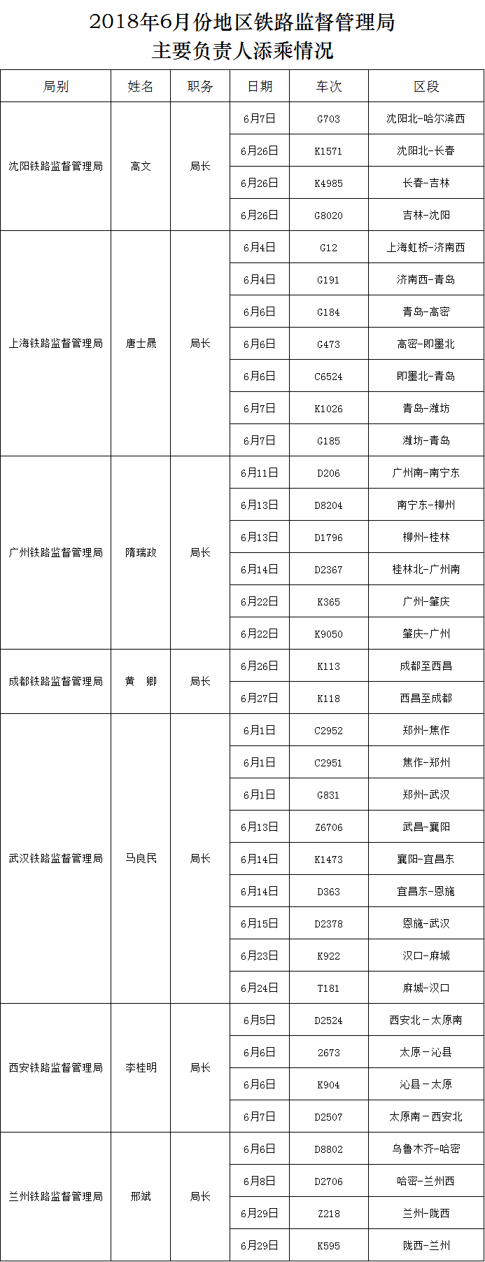 2018年6月份地区铁路监督管理局主要负责人添乘情况