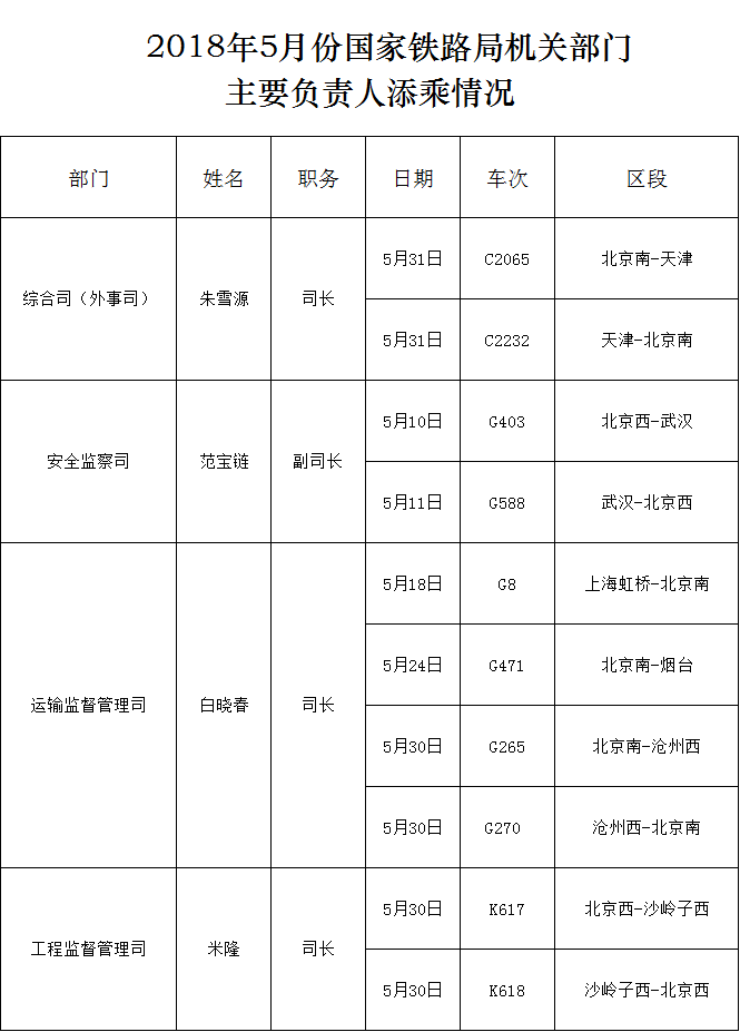 2018年5月份国家铁路局机关部门主要负责人添乘情况