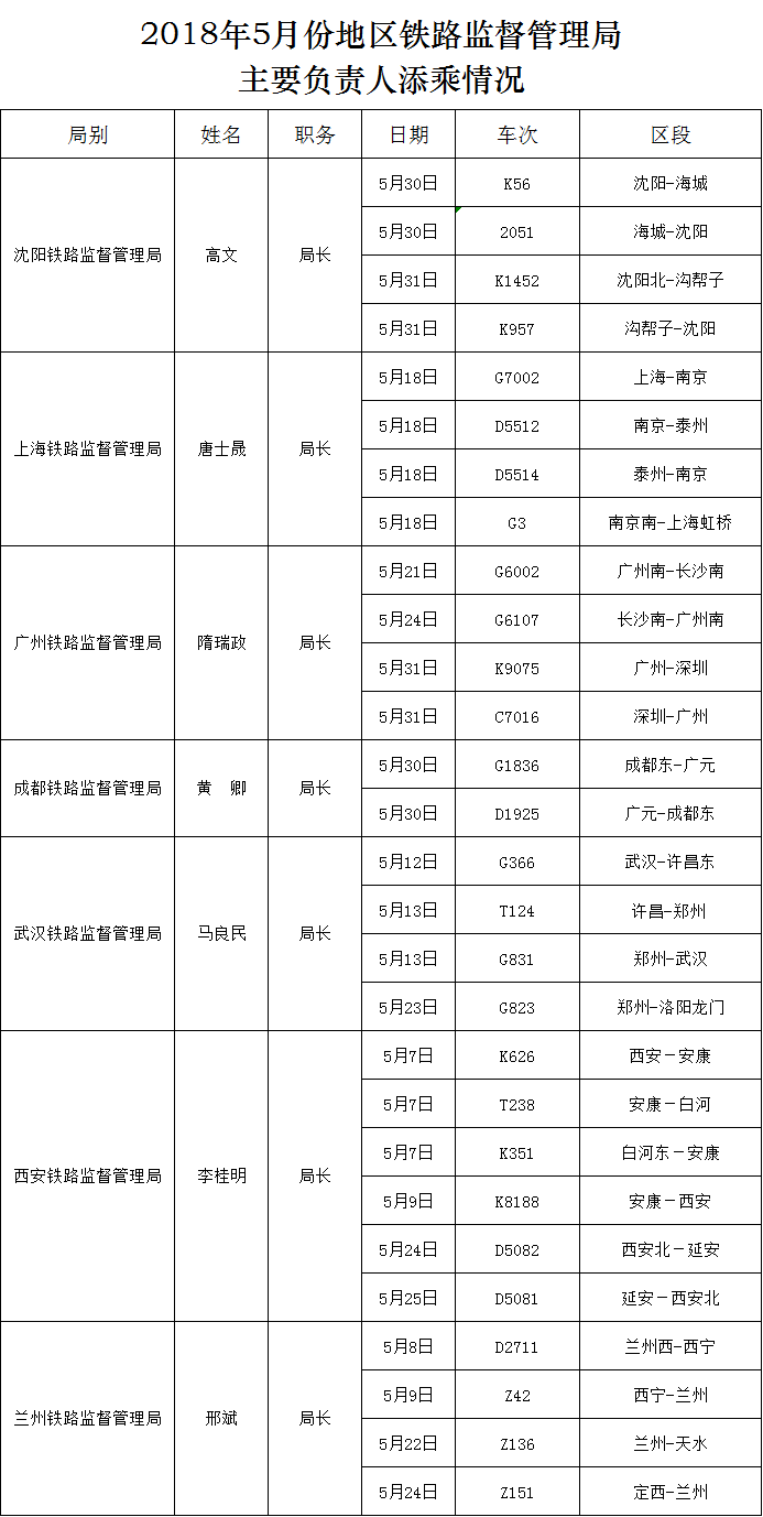 2018年5月份地区铁路监督管理局主要负责人添乘情况