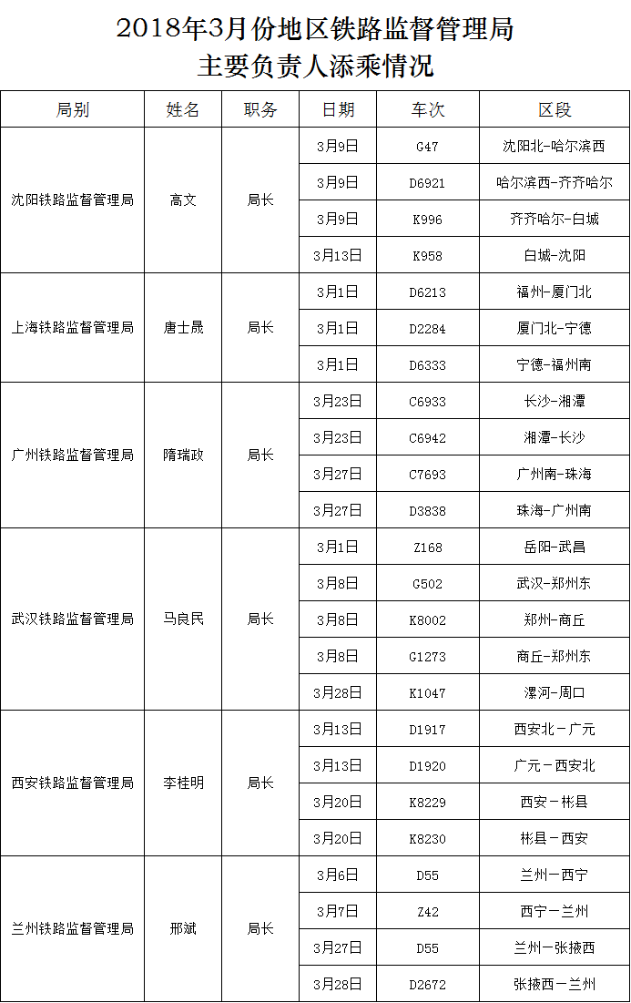 2018年3月份地区铁路监督管理局主要负责人添乘情况