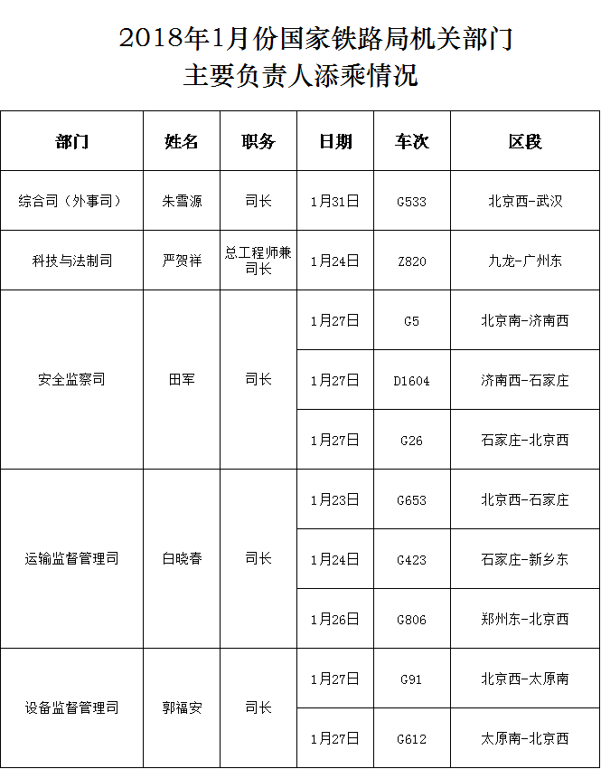 2018年1月份国家铁路局机关部门主要负责人添乘情况