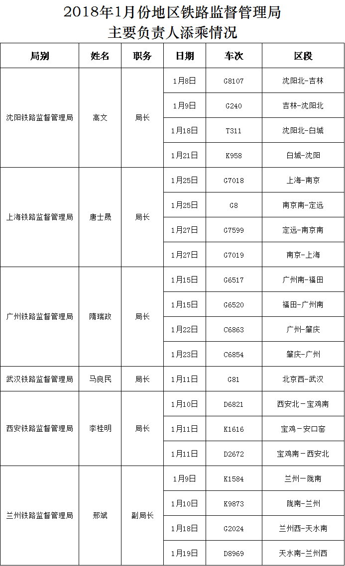 2018年1月份地区铁路监督管理局主要负责人添乘情况