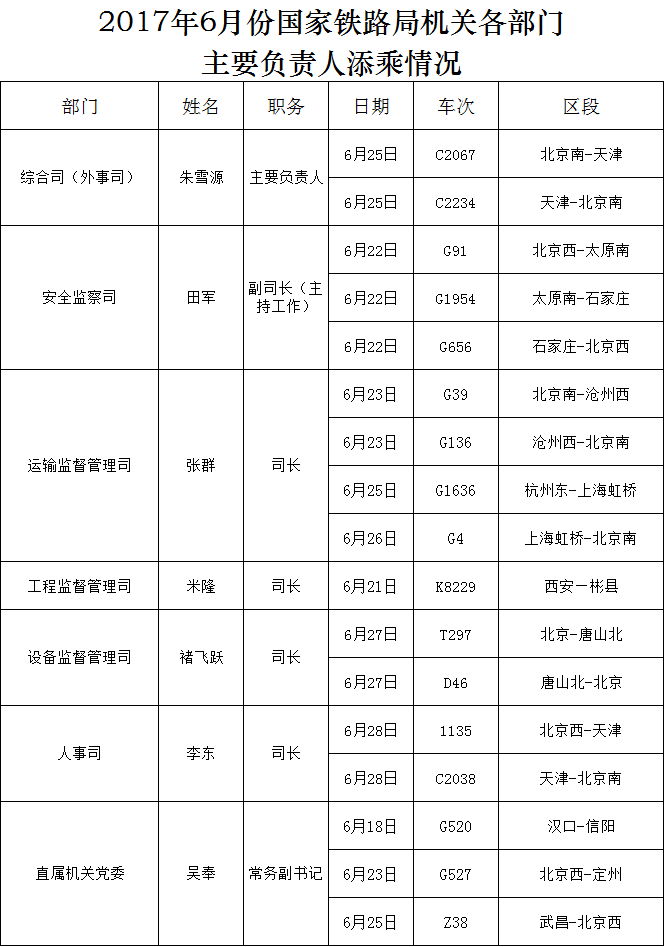 2017年6月份国家铁路局机关各部门主要负责人添乘情况