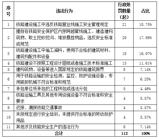 依法查处铁路安全生产违法行为。深化铁路行业“打非治违”专项行动,积极协调地方政府及有关部门和企业,对涉及高铁安全的重点挂牌督办事项,加大推进力度,完成历史遗留的32座上跨高铁立交桥移交工作,完成高铁安全保护区划定10356公里。加大对影响铁路建设工程质量、运输安全、特别是非法穿越铁路施工等违法行为的打击力度,全年共调查处理群众投诉举报398件,依法查处制止铁路安全生产违法行为1005起,其中共发出问题整改通知书688份,依法实施行政处罚112起,上缴国库罚没款1825.6万元。