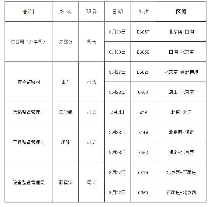 2019年8月份国家铁路局机关部门主要负责人添乘情况