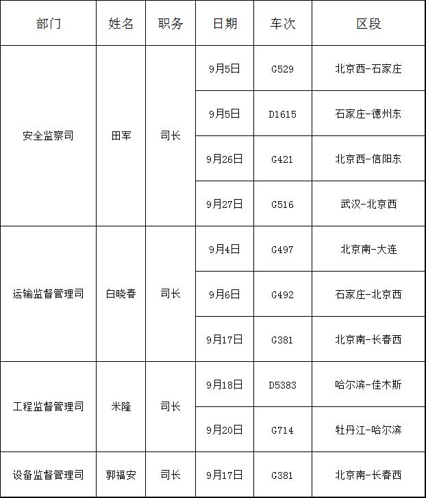 2019年9月份国家铁路局机关部门主要负责人添乘情况