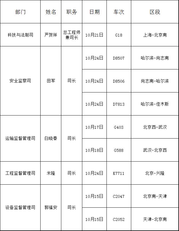 2019年10月份国家铁路局机关部门主要负责人添乘情况