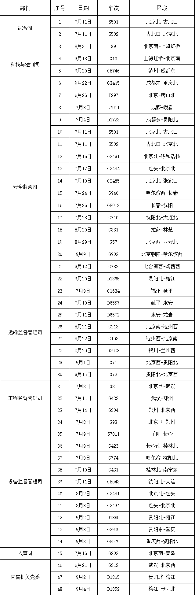 2024年三季度国家铁路局机关部门负责人添乘情况
