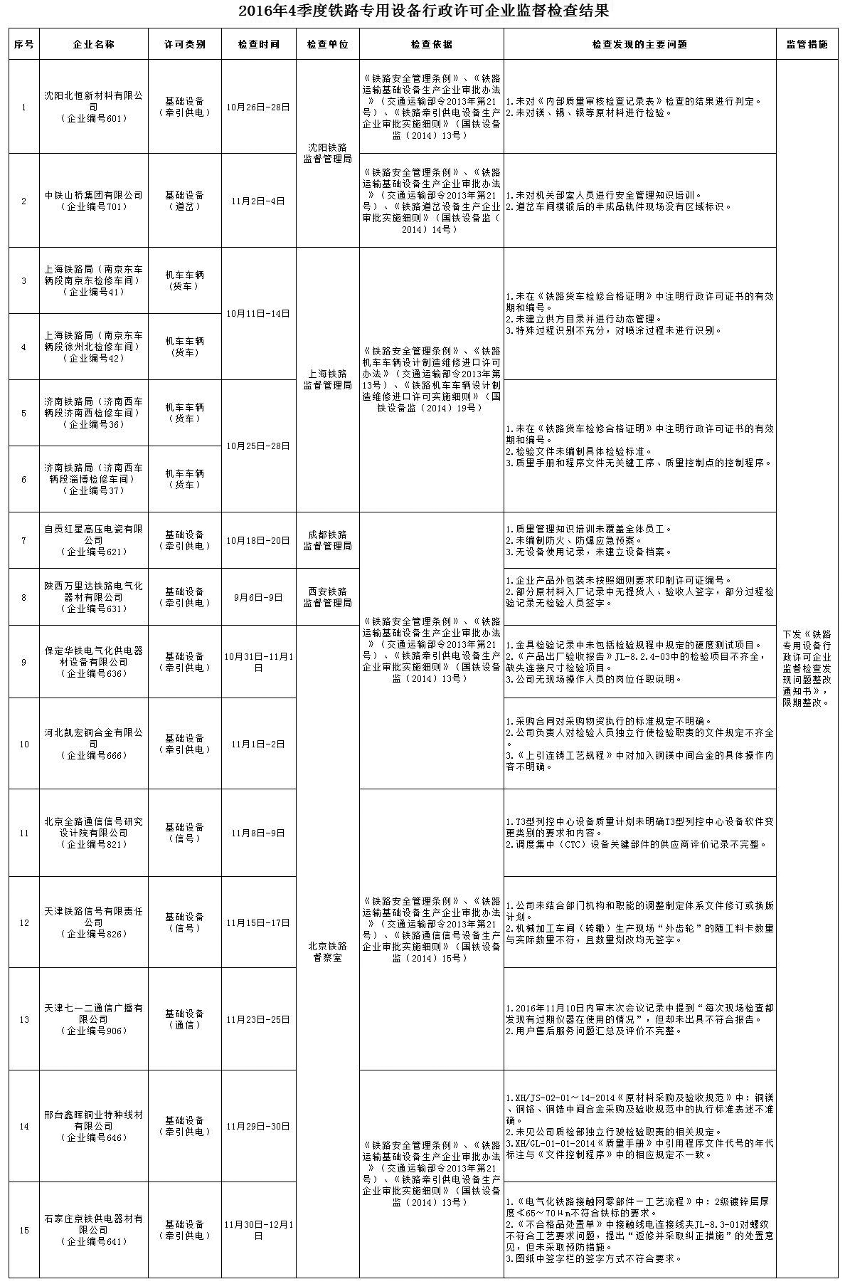 2016年4季度,国家铁路局认真贯彻落实国务院“放管服”改革和“双随机、一公开”监管改革要求,持续加强铁路设备产品质量安全监管工作。按照《2016年度铁路专用设备行政许可企业监督检查计划》(国铁设备监函〔2015〕257号),通过摇号随机确定铁路专用设备行政许可受检企业并组织开展监督检查,共监督检查铁路专用设备行政许可企业15家(铁路机车车辆企业4家、铁路运输基础设备企业11家),发现问题52项,下发《铁路专用设备行政许可企业监督检查发现问题整改通知书》13份。对监督检查发现的问题,各相关企业要按要求整改到位,并将整改情况及时反馈检查单位。国家铁路局将结合履职工作实际,适时对企业整改情况进行复查。现将监督检查结果通报如下: