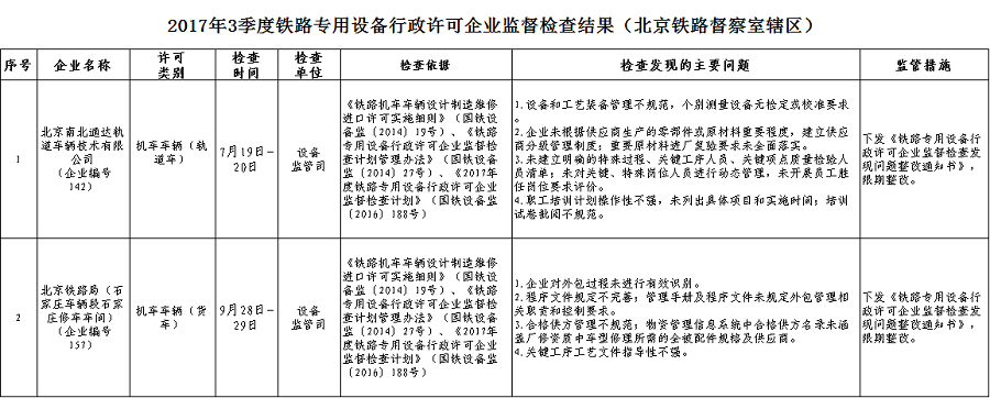 3季度,各地区铁路监督管理局认真按照《2017年度铁路专用设备行政许可企业监督检查计划》(国铁设备监函〔2016〕188号),对辖区内摇号随机确定的铁路专用设备行政许可受检企业按程序、按标准开展监督检查,共检查企业13家,发现问题114项,下发《铁路专用设备行政许可企业监督检查发现问题整改通知书》13份。按企业生产类别分,铁路机车车辆生产企业7家、铁路运输基础设备生产企业6家;按企业监管辖区分,沈阳铁路监督管理局辖区3家、上海铁路监督管理局辖区2家、成都铁路监督管理局辖区2家、武汉铁路监督管理局辖区2家、西安铁路监督管理局辖区2家、兰州铁路监督管理局辖区2家。设备监督管理司牵头组织对北京铁路督察室辖区内2家铁路专用设备行政许可受检企业(均为铁路机车车辆生产企业)开展监督检查,共发现问题8项,下发《铁路专用设备行政许可企业监督检查发现问题整改通知书》2份,监督检查情况详见附表。