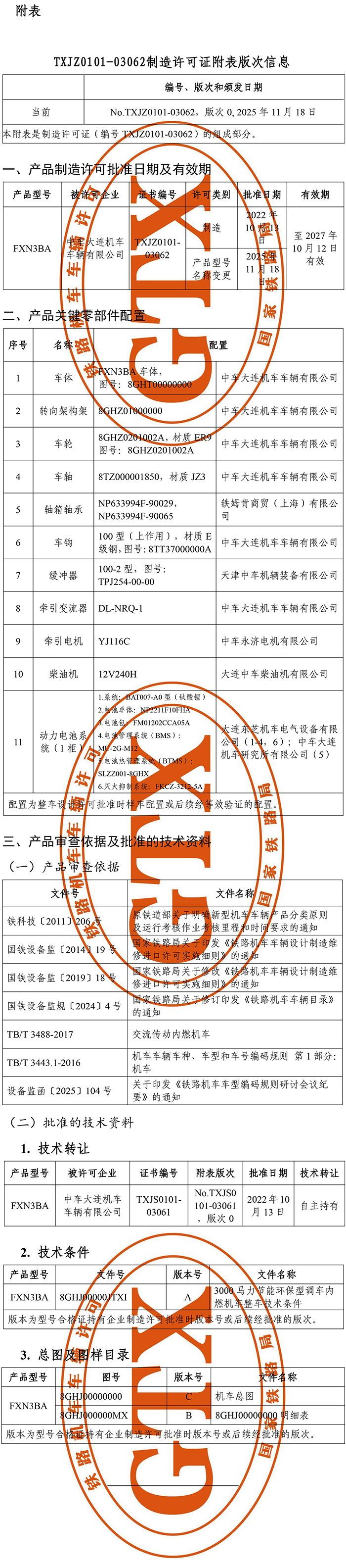 准予将铁路机车车辆制造许可证单位(证书编号:TXJZ0101-03062)中的产品型号名称由“FXN3B”变更为“FXN3BA”,并向你单位颁发变更后的行政许可证书,仅限于从事许可活动范围(见附表)规定的铁路机车车辆制造。证书编号和有效期不变,同时收回原行政许可证书。