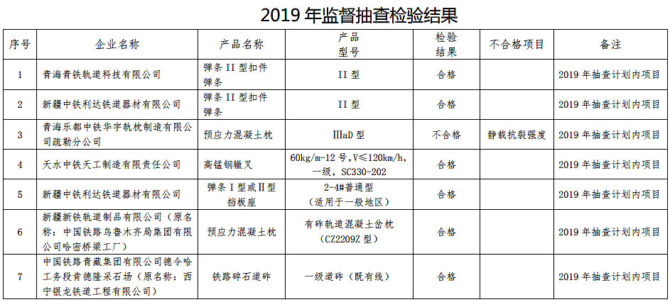 根据《铁路专用产品质量监督抽查管理办法》(国铁设备监〔2017〕79号),现将2019年铁路专用产品质量监督抽查情况通报如下: