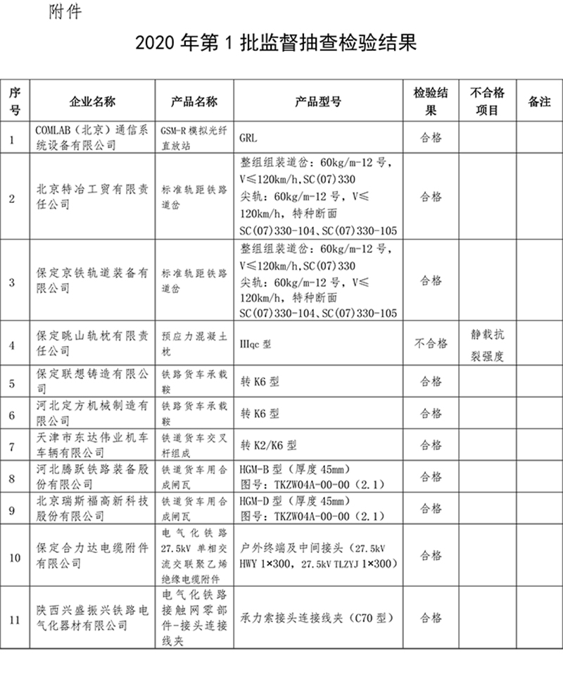 根据《铁路专用产品质量监督抽查管理办法》(国铁设备监﹝2017﹞79号),现将2020年第1批铁路专用产品质量监督抽查情况通报如下: