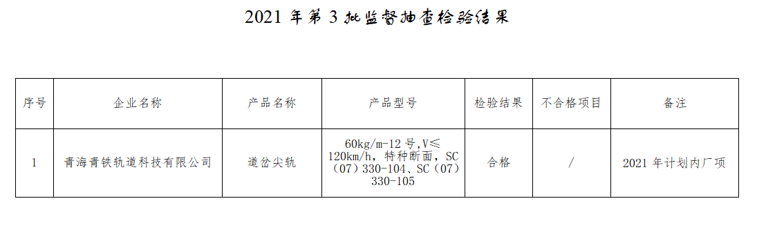 根据《铁路专用产品质量监督抽查管理办法》(国铁设备监规〔2020〕63号),现将2021年第3批铁路专用产品质量监督抽查情况通报如下: