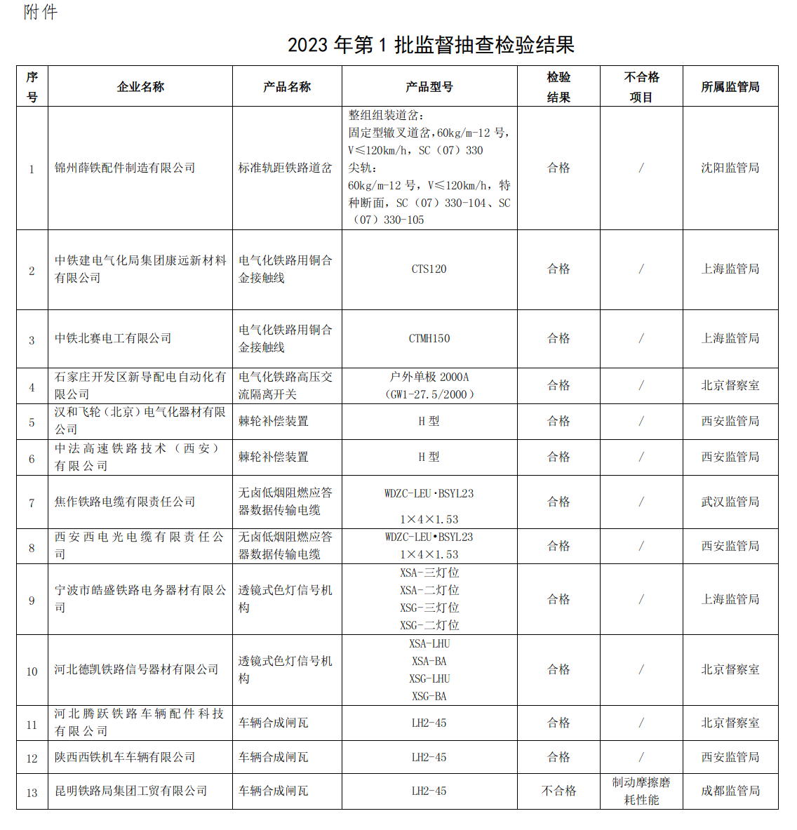 根据《铁路专用产品质量监督抽查管理办法》(国铁设备监规〔2023〕18号)相关要求,现将2023年第1批铁路专用产品质量监督抽查情况通报如下: