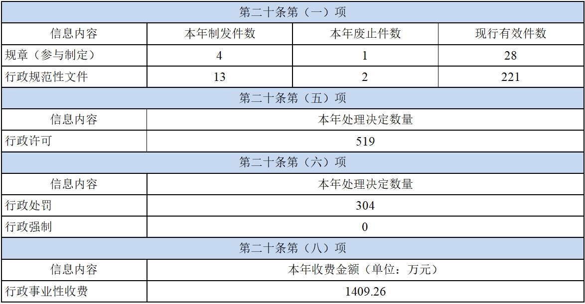 (一)加强政府信息主动公开。2023年,政府网站、政务微博、微信公众号发布各类信息7003条。及时发布规章、行政规范性文件、行业标准公告、行业统计、行政许可、行政处罚、监督检查、部门预决算等各类履职信息。同时,依托中央政府采购网集中采购平台、国家公务员考试网等,公开发布政府采购、公务员招录等信息。