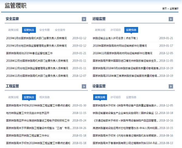 (二)日常监管执法信息。一是组织召开2018年春运监管工作动员部署会议、铁路工程监管工作会议、地方铁路监管工作交流座谈会,及时发布信息。二是发布《铁路行政执法人员管理办法》《铁路专用设备产品质量安全监督管理办法》《2018年度铁路专用设备行政许可企业监督检查计划》,按季度分批次发布铁路专用设备行政许可企业监督检查情况及监督抽查铁路产品质量情况的通报,并及时发布了投诉举报问题调查处理信息。三是指导各地区铁路监管局通过国家铁路局政府网站专栏公开行政处罚信息。并及时发布高铁沿线安全环境问题排查整治情况、“4·12”京广下行线塌方事故、《2017年铁路安全情况公告》等信息。四是组织开展铁路运输高峰期、恶劣气象条件和重要国事活动期间等关键时期的监督检查,并发布监督检查信息。五是按月发布局机关各部门、各地区铁路监管局主要负责人添乘情况。同时,抓好安全生产月等专题活动的监管信息发布。