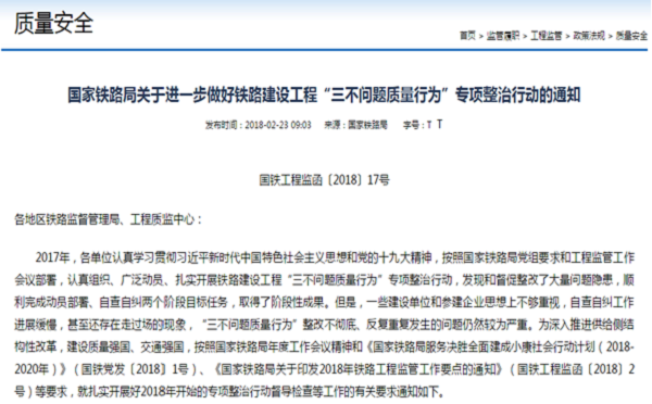 (三)铁路重大建设项目监管信息。一是发布2018年铁路工程监管工作要点,以及开展铁路建设工程“三不问题质量行为”专项整治、加强铁路建设工程材料构件设备产品质量进场验收、加强铁路工程质量安全监督检查等工作的通知,推进铁路工程监管工作的信息公开。二是公开《铁路工程建设项目招标投标管理办法》以及铁路工程建设市场秩序监管信息。