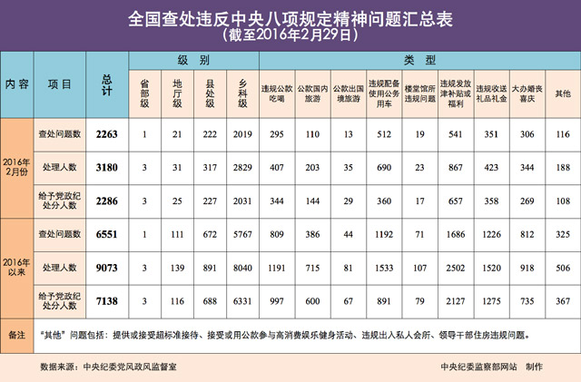 2016年2月全国查处违反中央八项规定精神问题2263起