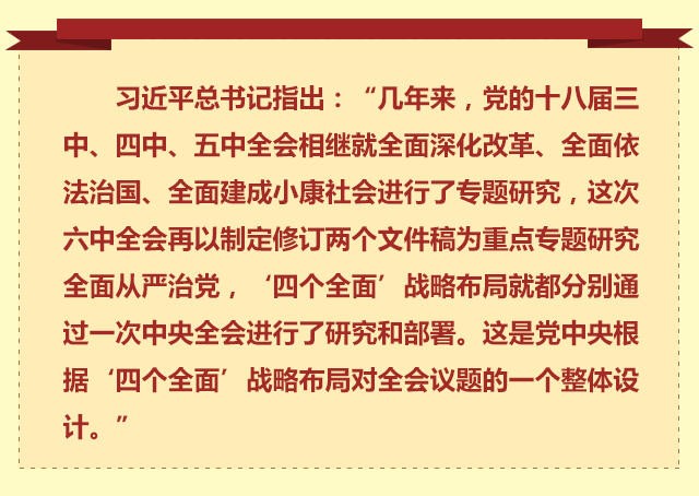 六中全会闭幕后,有外电评论:“四个全面”战略布局将中共管党治党提升到了国家发展战略的新高度;这次全会对全面从严治党作出新部署,巩固了“四个全面”战略布局治国理政总方略的地位。 4年前,习近平总书记履新伊始,就把党要管党、从严治党放在更加突出的位置。“打铁还需自身硬”,他用通俗易懂的语言,向人民作出庄严承诺。 2年前,在江苏考察时,习近平总书记强调,全面从严治党是推进党的建设新的伟大工程的必然要求。在“从严治党”之前加上“全面”两字,展现出党中央的远见卓识和使命担当,也完整勾画出“四个全面”战略布局。 协调推进“四个全面”战略布局,是党的十八大以来党中央从实现“两个一百年”奋斗目标、实现中华民族伟大复兴的中国梦的战略高度,统筹国内国际两个大局,把握我国发展新特征确定的治国理政新方略,是新的时代条件下推进改革开放和社会主义现代化建设、坚持和发展中国特色社会主义的战略抉择。