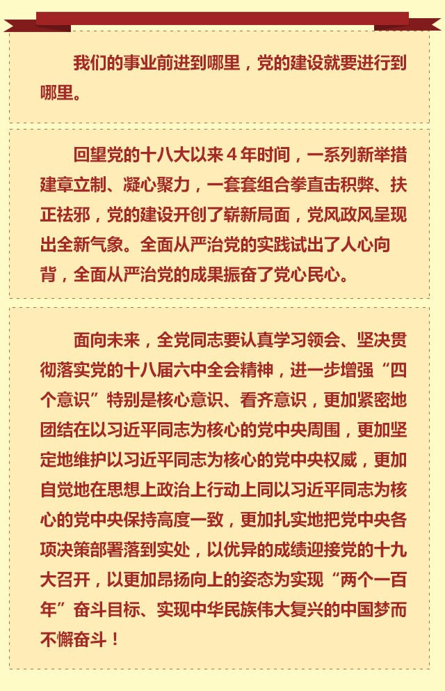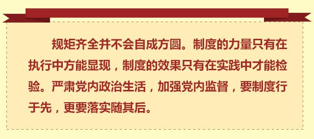 思想是根本,规矩是保障。 党的十八大以来,党中央以作风建设为突破口,在党的群众路线教育实践活动中强基固本,在党风廉政建设和反腐败斗争中激浊扬清,在“三严三实”专题教育中锤炼党性,在“两学一做”学习教育中砥砺全党,思想建党的步伐坚实有力。 党的十八大以来,党中央陆续出台《中国共产党廉洁自律准则》和《中国共产党纪律处分条例》,为全党树立了道德高线和纪律底线;出台《党政领导干部选拔任用工作条例》,构建科学有效的选人用人机制;出台《推进领导干部能上能下若干规定(试行)》,推动形成能者上、庸者下、劣者汰的用人机制……依规治党的决心毫不动摇。 立规明矩,纲举目张。随着这次《准则》和《条例》的正式施行,全面从严治党掀开了崭新一页。 严肃党内政治生活,只有抓好思想教育这个根本,才能教育党员、干部筑牢信仰之基、补足精神之钙、把稳思想之舵;只有抓好严明纪律这个关键,才能把纪律规矩立起来、严起来,切实扎紧织密制度的笼子;只有抓好选人用人这个导向,才能以用人环境的风清气正促进政治生态的“山清水秀”;只有用好组织生活这个经常性手段及批评和自我批评这个武器,才能加强经常性教育、管理、监督,彰显党内政治生活的本质。 不断加强党内监督,各级党委要肩负起主体责任,强化管党治党的责任担当,把监督责任牢牢扛在肩上,敢抓敢管、勇于监督;纪委和党的工作部门要各司其职,充分履行监督执纪问责职责;充分发挥党员的民主监督作用,同时把党内监督与人民监督结合起来,共同推动全面从严治党不断走向深入。