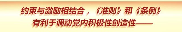 “不准”“不能”“禁止”……《准则》和《条例》中,对党员、干部的行为规范划定了“底线”“红线”,尺度更严、标准更高。 是约束也是激励,约束与激励辩证统一。 参加审议的中央委员认为,全面从严治党,全党都严格遵守政治纪律和政治规矩,这就是对党员、干部和各级党组织的最大保护。 《准则》和《条例》中都有很多对党员、干部的激励性、保护性规定。比如:干部是党的宝贵财富,必须既严格教育、严格管理、严格监督,又在政治上、思想上、工作上、生活上真诚关爱,鼓励干部干事创业、大胆作为;领导机关和领导干部不准以任何理由和名义纵容、唆使、暗示或强迫下级说假话;建立容错纠错机制,宽容干部在工作中特别是改革创新中的失误;任何组织和个人不得自行决定或受指使对党员、干部采取非法调查手段;党组织应当保障党员知情权和监督权,鼓励和支持党员在党内监督中发挥积极作用;对干扰妨碍监督、打击报复监督者的,依纪严肃处理。这些规定,有利于充分调动党员、干部的积极性。 约束与激励相结合,正是依规治党的初衷。《准则》和《条例》都是为了努力在全党形成又有集中又有民主、又有纪律又有自由、又有统一意志又有个人心情舒畅生动活泼的政治局面。