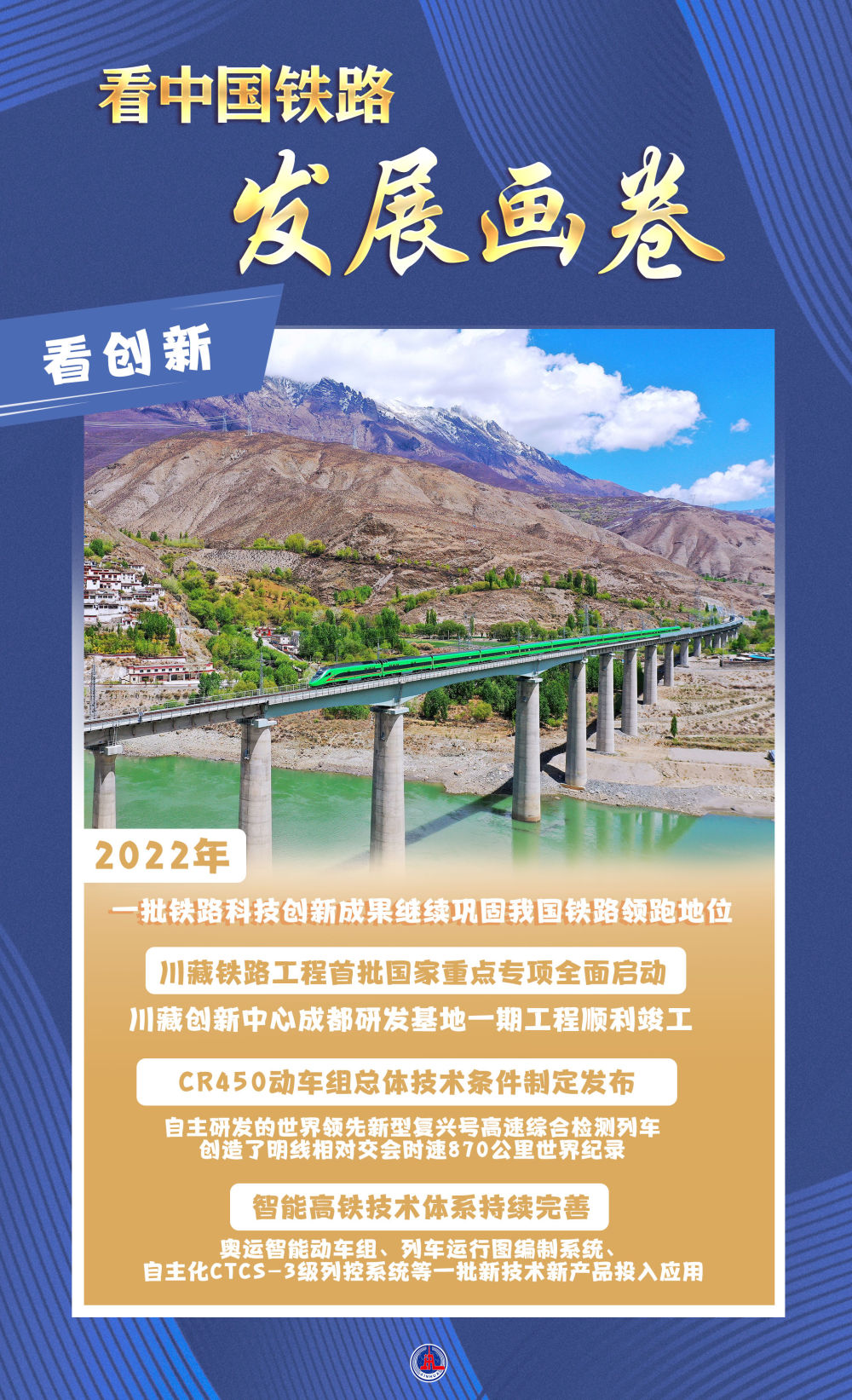 2022年,一批铁路科技创新成果继续巩固我国铁路领跑地位:川藏铁路工程首批国家重点专项全面启动,川藏创新中心成都研发基地一期工程顺利竣工;CR450动车组总体技术条件制定发布,自主研发的世界领先新型复兴号高速综合检测列车创造了明线相对交会时速870公里世界纪录;智能高铁技术体系持续完善,奥运智能动车组、列车运行图编制系统、自主化CTCS-3级列控系统等一批新技术新产品投入应用。