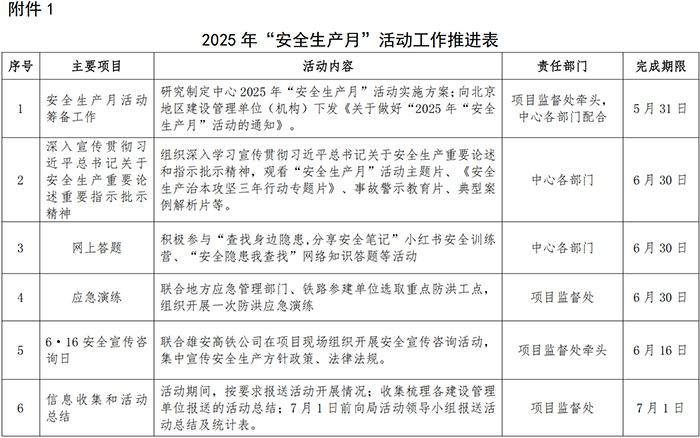 按照《国家铁路局关于印发2025年“安全生产月”活动实施方案的通知》(国铁安监函〔2025〕67号)要求,结合工作实际,制定了《工程质量监督中心2025年“安全生产月”活动实施方案》,现印发给你们,请认真落实执行。